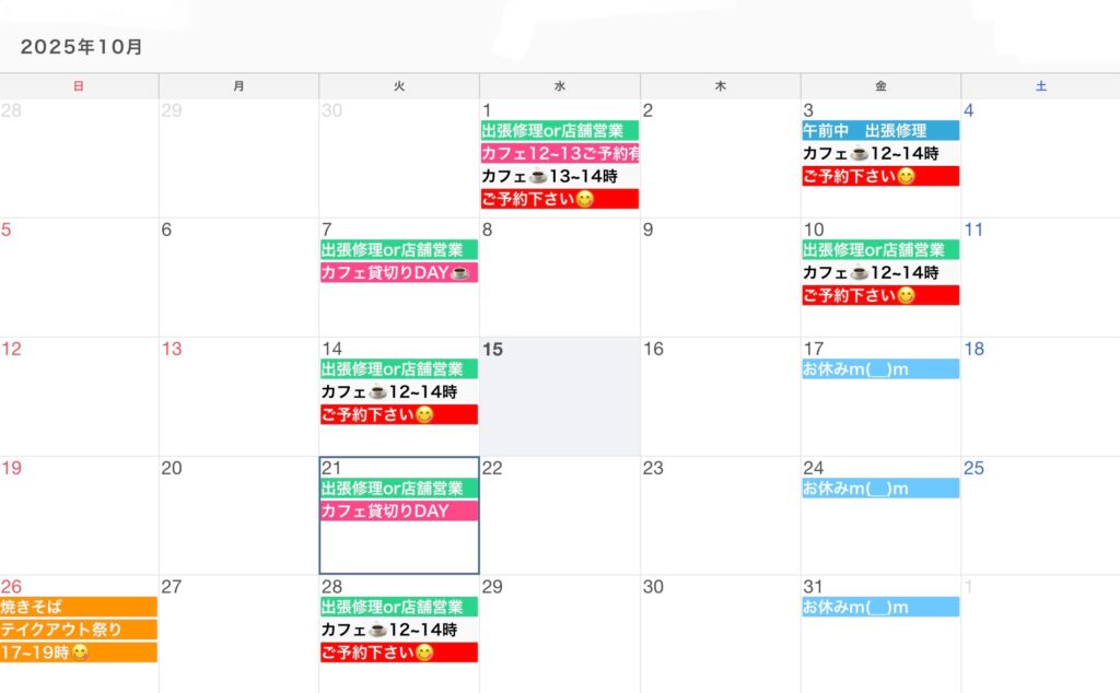 9月の営業予定 クリックするとカレンダーへ飛びます^_−☆