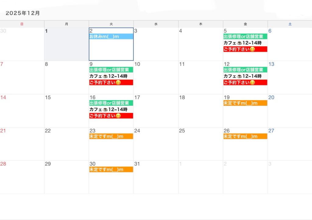 12月の営業予定(クリックするとカレンダーへ移動します^_−☆)