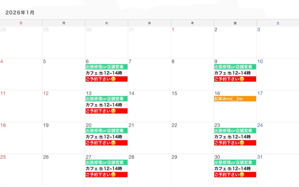 1月の営業予定。クリックするとカレンダーへ移動します^_−☆
